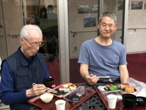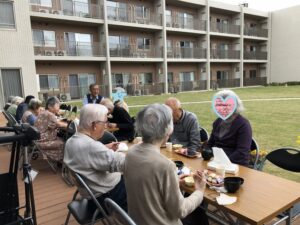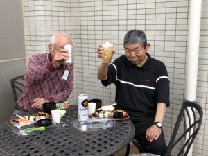 テーブルを並べてお外で食べるお寿司は格別🍣